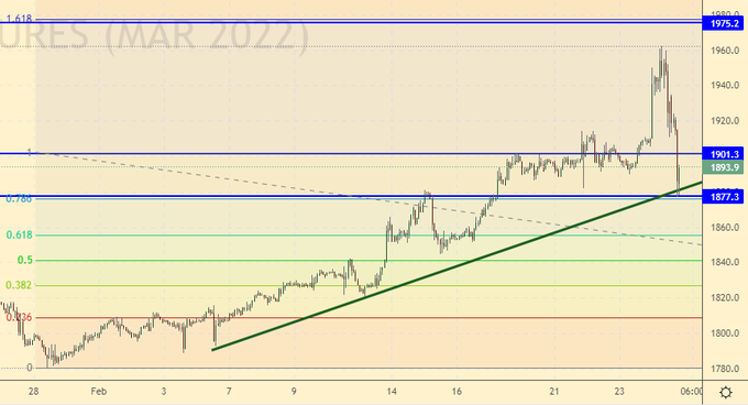 Уже сегодня ночью рынок не увидел оснований для продолжения роста на фоне конфликта между Украиной и РФ. В условиях неопределенности будущего миропорядка доллар начал получать дополнительные бонусы, что может отразиться и на стоимости золота. Нельзя исключать разворота рынка вниз.