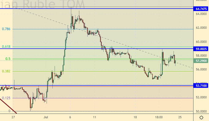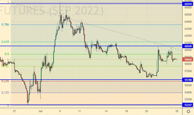 Покупка: нет. Кто в позиции от 56000 и 57000, перенесите стоп на 56000. Цель: 75000.