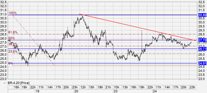 Вряд ли до вечера мы увидим попытки подняться выше 28.00, так как данный рост будет предполагать развитие восходящего движения до 31.00, а затем и до 34.50, а оно должно быть в текущей ситуации фундаментально обоснованно.