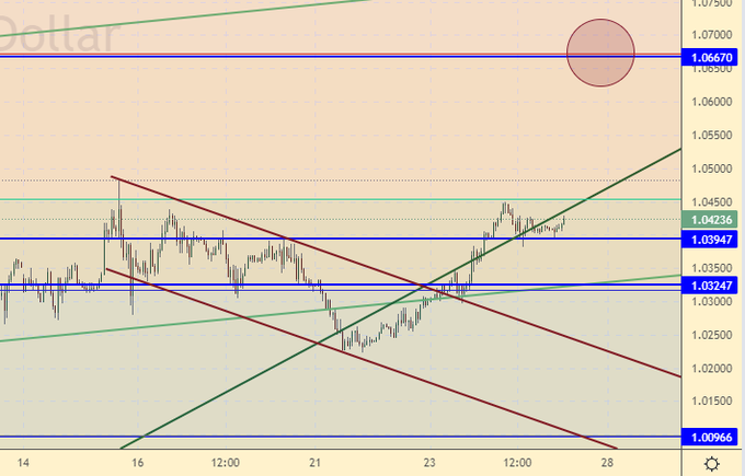 Покупка: в случае роста выше 1.0450. Стоп: 1.0410. Цель: 1.0650. При откате к 1.0000. Стоп: 0.9934. Цель: 1.1000.