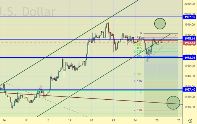 Всё, что может дать нам рынок, для разумного входа в лонг, это падение к 1920. Но его нет, так как есть вероятность конфликта США – Иран. Если он начнется, то цены на золото продолжат рост, а американцы продолжат печатать деньги.