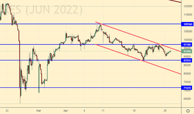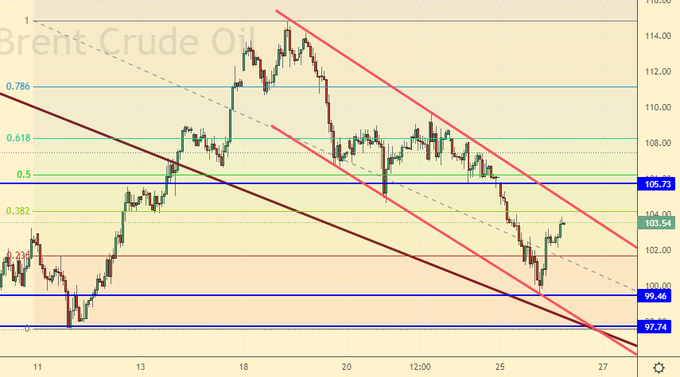 Быки не дали вчера рынку уйти ниже 100.00, однако риск падения цен остается. В Европе пока только разговоры о том, чтобы запретить энергоносители из России, при этом под шумок экспорт растет. То есть в начале хотят запастись, а потом отказаться. Но запасов на долго не хватит, снова придется покупать. Появилось ощущение, что Запад в вопросе отказа от покупок энергоносителей не сможет сделать ничего.