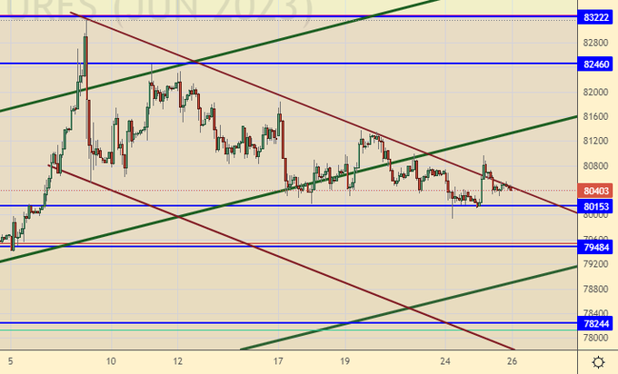 Продажа: нет. Кто в позиции от 82.50 и 82.00, держите стоп на 82.60. Цель: 78.00.