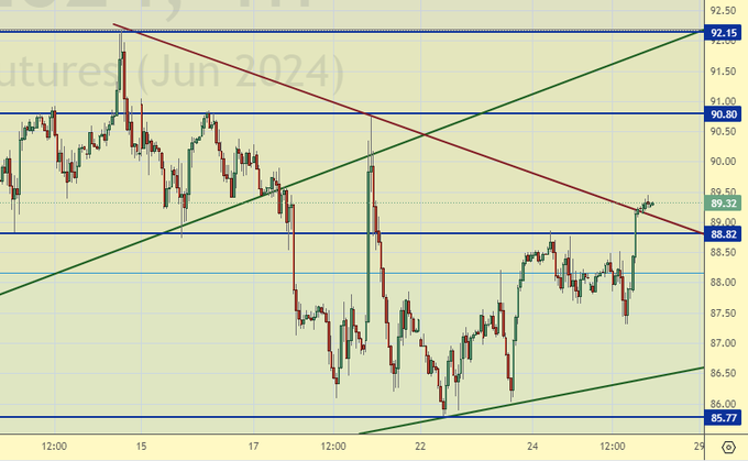 Продажа: сейчас (89.32). Стоп: 90.70. Цель: 81.00. Кто в позиции от 88.45, перенесите стоп на 90.70. Цель: 81.00. Считайте риски!