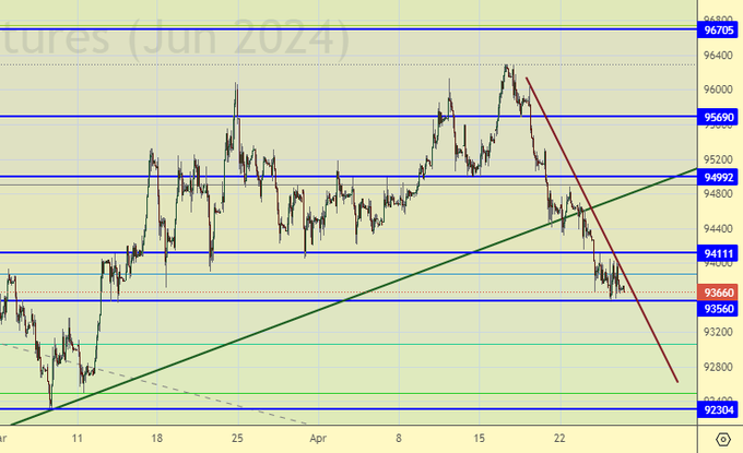 Продажа: при подходе к 94800. Стоп: 95300. Цель: 90000.
