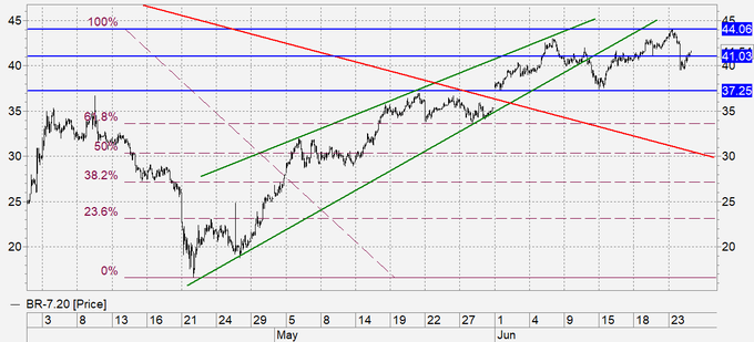 Продажа: возможна, при появлении сигналов разворота вниз. Кто в позиции от 42.90 и 44.00, держите стоп на 44.60. Цель: 28.00.