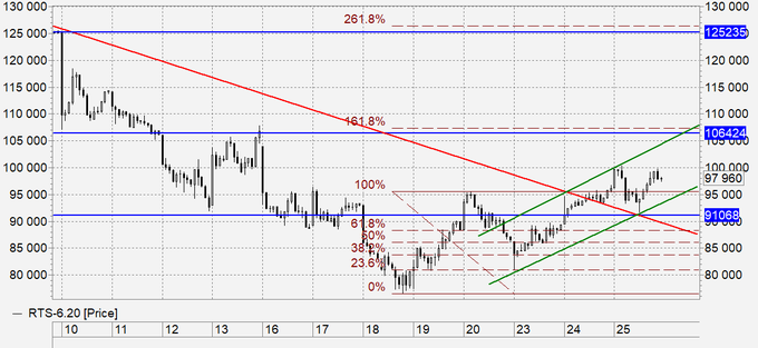 Индекс РТС: отметка 106000 продолжает занимать наши умы. Пока мы остановились под 100000, оно сегодня укрепление рубля продолжится, что позволит достигнуть уровня 106000. Дальнейшее движение вверх пока не просматривается. Из плюсов отметим, что правительство не теряет контроль за ситуацией, это создает дополнительную поддержку рынку акций.