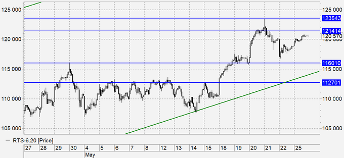 Продажа: при падении ниже 120000 и при одновременном падении нефти. Стоп: 121700. Цель: 113000.