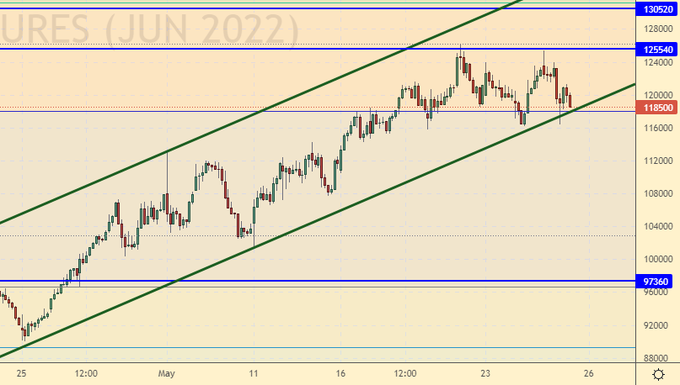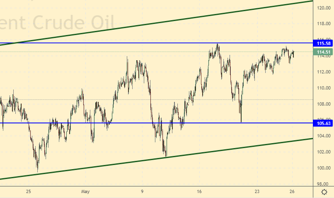 Пока признаков разворота вниз не видим. В случае роста выше 115.00 есть шансы на ход к 120.00 и 125.00. Для хода на 150.00 в ЕС должны ввести эмбарго на российскую нефть.
