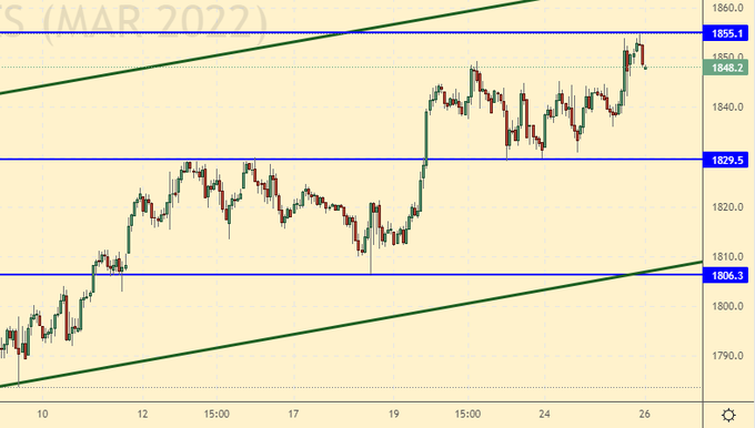 Быки пока не могут закрепиться выше 1850, и вряд ли это им удастся до объявления решения по ставке ФРС сегодня вечером. Если мы не услышим от Пауэлла сильных заявлений золото продолжит свой рост. Кроме международной напряженности учитываем и тот факт, что фондовый рынок США готов скорректироваться вне зависимости от того будет ставка повышена или нет. Часть денег от проданных акций может припарковаться в золоте.
