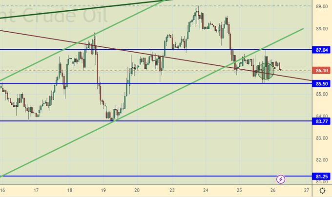 Продажа: сейчас и при подходе к 87.20. Стоп: 87.34. Цель: 70.00.