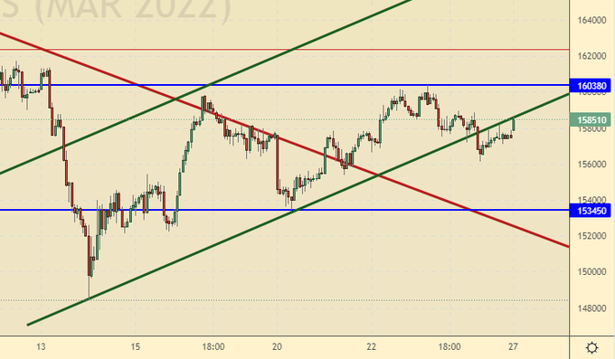 Продажа: нет. Кто в позиции от 159000 и 160000, держите стоп на 161700. Цель: 145000.