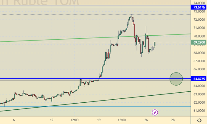 Обязательно покупать в случае хода к 65.00. Если рынок не даст эту возможность, то придется брать по текущим ценам, что тяжело с моральной точки зрения. Да, мы взяли ход от 60.00 до 72.00, но прошлые победы ничего не стоят, нужны новые. В текущих условиях серьезное укрепление рубля невозможно.