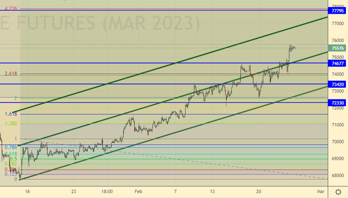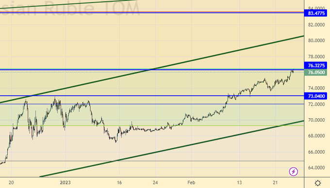 Рубль не хочет падать. Район 76.30 претендует на роль сопротивления, от которого возможен откат и замедление восходящего движения, но пока явных признаков того, что мы увидим даже незначительное укрепление рубля у нас нет. Имеет смысл докупать на откатах вниз.
