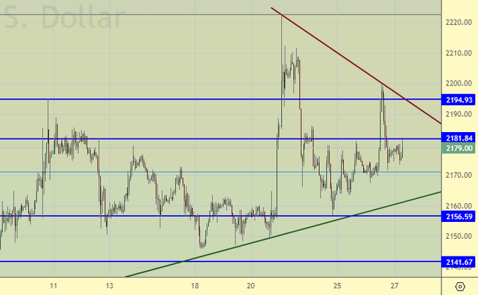 Попытка прорваться выше 2200 провалилась, что выдает нам с головой группу граждан разных стран, которая готова расстаться с золотом на этом уровне. Значит, есть спрос на доллары, и кого-то ситуация вынуждает продавать золото, хотя долгосрочные перспективы по нему весьма привлекательные.