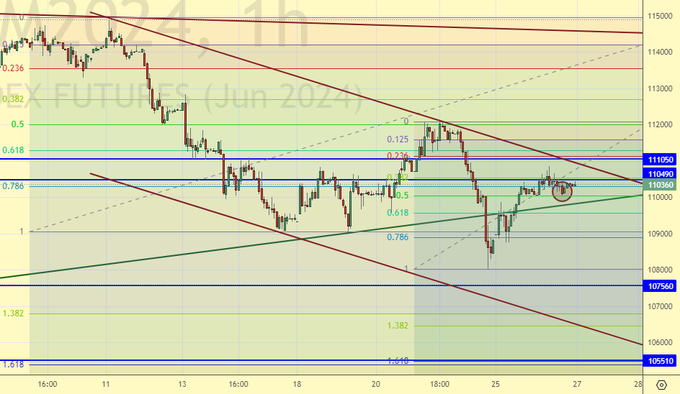 Нельзя отрицать попытку пробиться выше 111000, но если её не будет, то из текущей позиции рынок способен пройти вниз до 100000. Как и почему это произойдет мы не знаем, но иногда лучше торговать по технике и не задавать лишних вопросов. Желающие могут продать здесь или нарастить шорты.