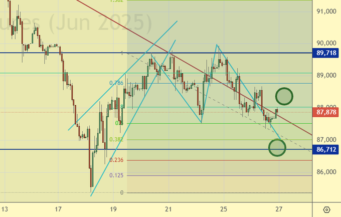 Давайте ударим в 86700, после чего начнем подниматься вверх. С мирными переговорами, без войны, всё понятно. Это пустая болтовня. Идею о том, что экономика будет принесена в жертву политике, мы уже высказывали, её здесь будет уместно повторить еще раз. Страна находящаяся в режиме массового производства конечной продукции, которая не мультиплицирует вложения, будет находиться в крайне уязвимом экономическом положении.