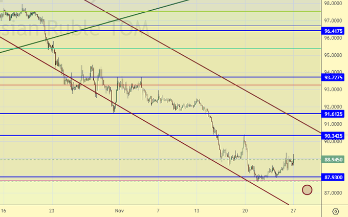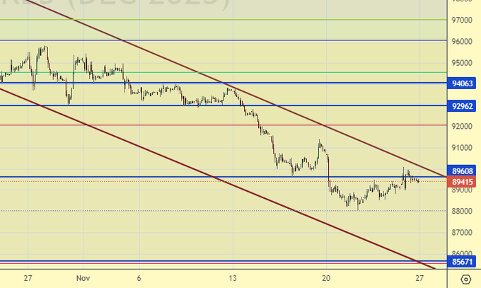 Всю неделю рынок будет ждать решения ОПЕК по поводу сокращения добычи нефти и сплоченности рядов участников. Любой раздрай вызовет стойкое желание продавать. При этом вряд ли нас ждет крах котировок, даже если не будет заявлено рядом стран о том, что они не готовы сокращать собственное предложение на внешнем рынке. В целом спрос на нефть остается высоким. Смотрим декабрьский контракт.