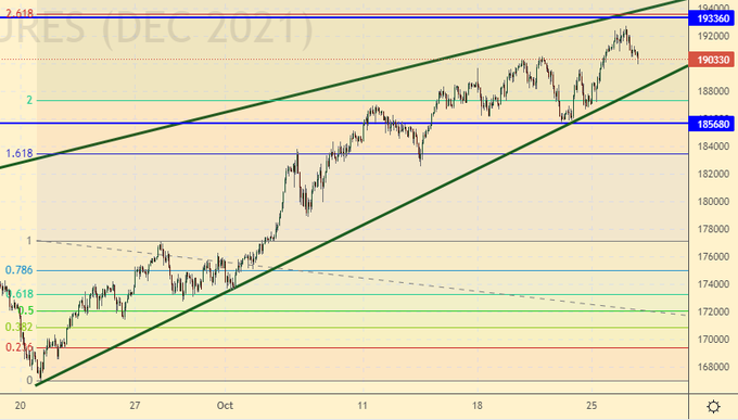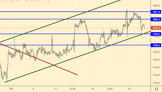 Продавцы золота пытаются пробить нижнюю границу растущего канала. Пока это у них не получается, однако, до заседания ФРС 3-го ноября еще есть время. Вряд ли до пресс-конференции Пауэлла на рынке будут сильные движения, поэтому нахождение рынка золота под 1800 до этой даты рассматриваем как весьма вероятное событие.