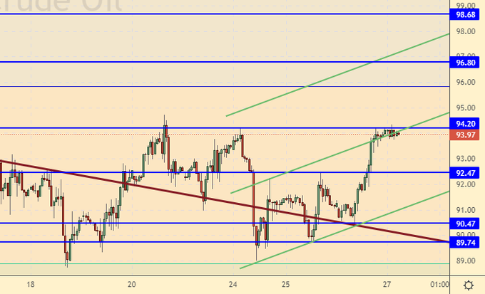 Согласно данным EIA запасы нефти в США за неделю выросли на 2.588 млн. баррелей. Изменение незначительное. Рынок предпочел заметить ослабление доллара, а не рост запасов в США, и вырос выше 93.00. Данное движение может привести уже сегодня к тому, что мы будем покушаться на уровень 95.00, если и он будет пробит, то продавцы просто уйдут с рынка и вернуться на него, может быть, в районе 110.00.