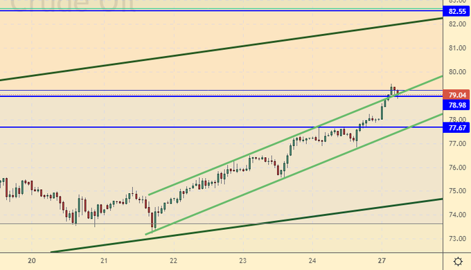 Утром понедельника цены на нефть продолжают своё восхождение на фоне энергетических проблем в Европе. После того как уровень 78.00 был взят открылась новая цель на 82.50. Пока нет причин для того, чтобы котировки приостановили свой рост. Кроме того, слабость доллара, которая ярко проявилась сегодня на азиатской сессии, не способствует падению цен на нефть.
