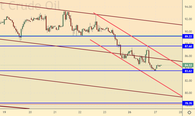 Продавцы протолкнули котировки ниже 85.00, получили отпор, но смогли остаться под этим уровнем. Сегодня давление на рынок нефти будет продолжено. Внизу у нас есть цель на 78.00, скорее всего туда рынок и пойдет.
