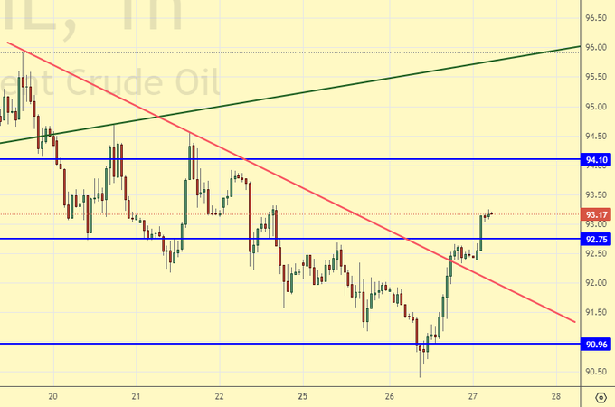 Рынок нефти учел все возможные бычьи новости и не может расти дальше без нового допинга. Вчерашний рост пока отнесем к коррекционному движению после падения. Подъем к 93.50 можно рассматривать как хорошую возможность для входа в шорт.