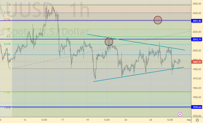 Ждем выход вниз из консолидации. Движение на 1940 скорее всего состоится, ход на 1860 также возможен. Не исключено, что перед заседанием ФРС 3-го мая мы увидим быстрый ход вниз. После падения ниже 1975 можно нарастить шорты.