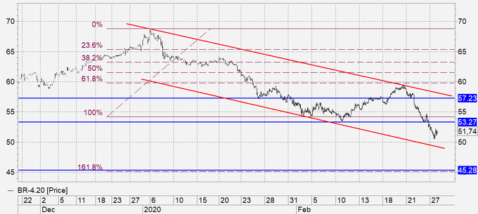 Несмотря на то, что уже больше половины заболевших вирусной инфекцией в Китае были вылечены, спокойствия это не добавляет. Мало того, что приходится держать на карантине целые города, так и само лечение на данном этапе обходится в копеечку. Ничего кроме падения спроса практически на все товары длительного пользования из складывающейся ситуации предположить нельзя. Если ОПЕК не пойдет на радикальные сокращения, нас ждет район 40.00.