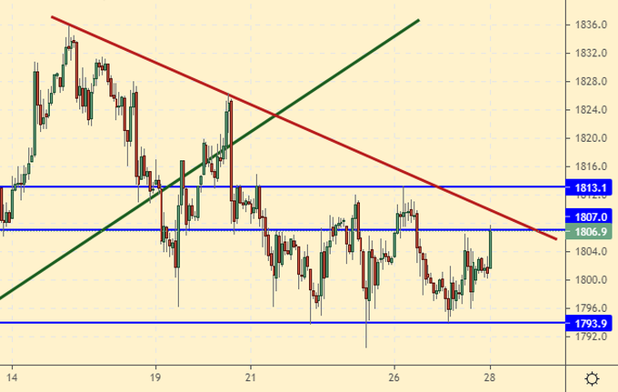 Золото утором среды робко посмотрело на верх. Продолжаем считать, что проход выше 1820 может привести к дальнейшему росту. Пока этого не произошло, будем отдавать предпочтение продавцам.