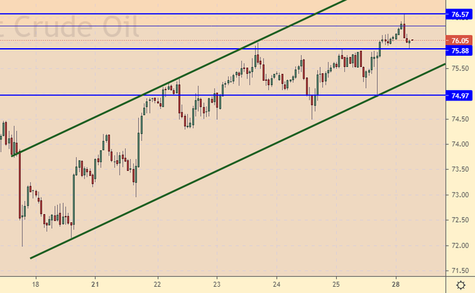 На утро понедельника быки продолжают контролировать рынок. Шанс на слом растущей тенденции появится только после падения цен ниже 74.50.