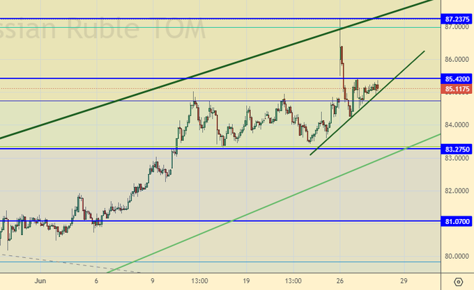 Желающих продавать валюту нет. Налоговый период не помогает. Не исключено, что уровень 85.00 станет нашей новой реальностью. Ход к 81.00 был бы возможен, но для него должен появится позитив. Пока же дефицит бюджета растет. Он уже оценивается в 3.9 млрд. рублей, что наводит на мысли о том, что без плавной девальвации не обойтись, тем более, что перспектив по снижению трат и росту доходов крайне мало.