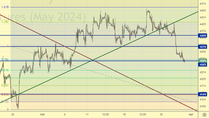 Летим вниз без какого-либо подъема наверх. Внизу у нас поддержка на 414.0, но она может и не устоять. Возможен провал к 360.0 на фоне сильных урожаев в последние несколько лет.