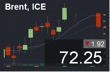 Цена в долларах за баррель. Для пересчета в доллары за тонну нефти марки Brent, необходимо цену умножить на 7,59.