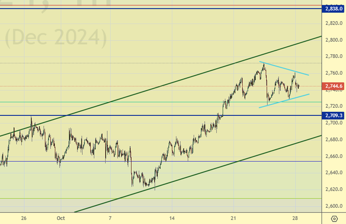 Видим небольшую консолидацию. Отметка 2838 пока основная для нас при данном развитии событий. Рынок в принципе уже не интересует кто-там кого на Ближнем Востоке… месит. Отметим, что золото может припасть в случае ухудшения настроений на фондовом рынке США. Но этого уже так давно не происходит, что народ начинает просто тупо верить в бесконечное счастье от роста котировок акций.