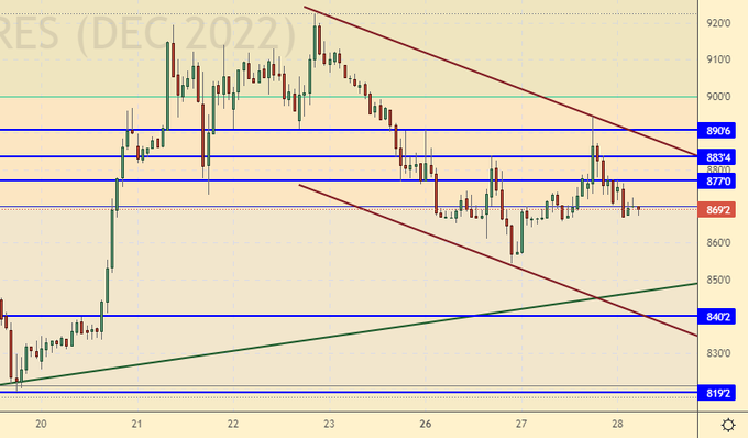Видим некоторое охлаждение на рынке пшеницы. Падением это назвать сложно, но некоторое снижение цен можно констатировать. Продавцам надо проталкивать рынок ниже 840.0 для того, чтобы можно было рассчитывать в дальнейшем на ход к 750.0.