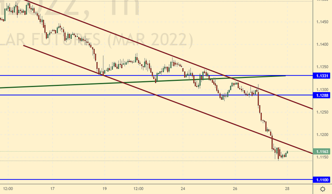 Продолжаем разряжаться к 1.1100. При подходе к данному уровню можно покупать. Есть большие сомнения в том, что доллар будет сильно доминировать над евро так как ЕЦБ вряд ли будет затягивать с повышением ставки на фоне высокой инфляции в Европе. Кстати, в американской среде снова появились рассуждения о том, что инфляция сама собой потухнет. Отметим, что это весьма опасные рассуждения.