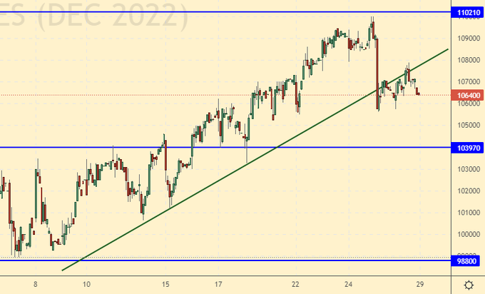 Перешли на декабрьский фьючерс. Российский рынок в пятницу немного испугался жестких заявлений Пауэлла по поводу крепкого доллара, и следом за американским фондовым рынком если не приклонил колено, то кивнул головой вниз. Так как перспективы роста российской экономики под большим вопросом, особенно на 2023-й год, то ожидать роста индекса РТС сложно.
