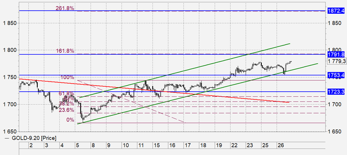 На фоне очередного витка ослабления американского фондового рынка цены на золото продолжили рост. Быки контролируют ситуацию. Показан новый локальный максимум. В случае роста выше 1780 можно добавить к открытым ранее позициям. Новые позиции на покупку открыть можно, но внимательно считайте риски.