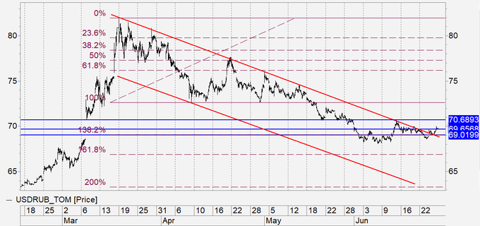 Поклонников у рубля с каждой торговой сессией всё меньше. Продолжим рекомендовать покупки пары. Четких целей пока не ставим. Есть некоторое снижение индекса RGBI, которое может перерасти в падение, что засвидетельствует снижение интереса инвесторов к российским облигациям, а это приведет и к снижению спроса на рубли.