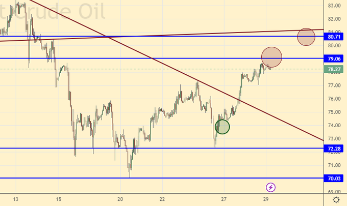 Продажа: сейчас и при подходе к 78.80. Стоп: 79.60. Цель: 66.67.