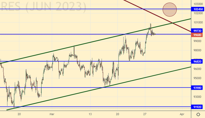Мы будем расти до тех пор, пока будет расти Сбербанк. Удивительное дело, рынок позитивно оценивает перспективы компании, обслуживающей половину жителей страны, чей уровень жизни падает и неспособную развиваться (выходить на другие рынки) из-за санкций. Тем не менее, имеем то, что имеем. Мы способны ударить в 102000, пройти выше будет крайне тяжело.