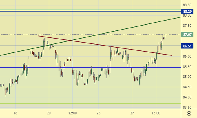 Покупка: при откате к 86.10. Стоп: 85.40. Цель: 94.00.