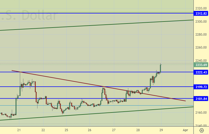 Покупка: при откате к 2200. Стоп: 2170. Цель: 2400.