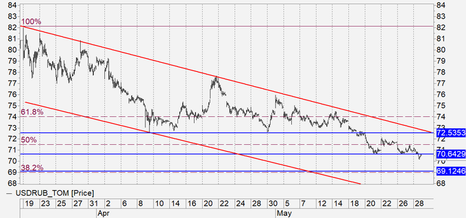 Не стали вчера разворачиваться вверх с начала торгов. Ничего страшного. Сегодня, в случае роста выше 71.20 можно покупать снова. Объем негатива от ситуации в экономике продолжит накапливаться. Падение выручки от продаж углеводородов на внешних рынках может оказать крайне негативный эффект на торговый баланс во втором квартале и это несмотря на падение импорта на 20%.