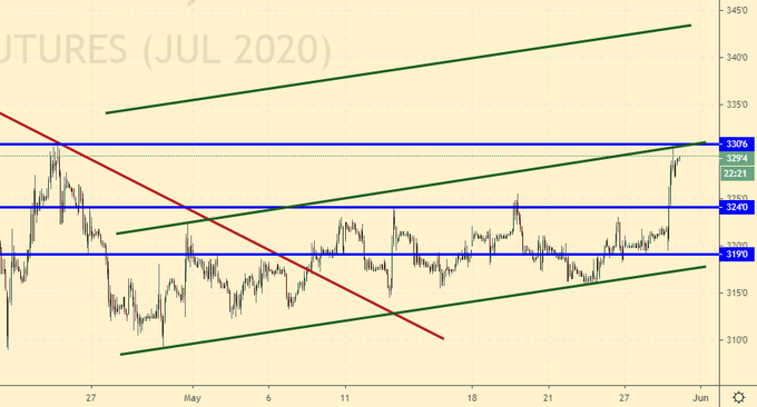 Синхронно с пшеницей кукуруза ушла вверх. Взяв 325.0 рынок создал предпосылки для движения к 350.0. Вряд ли рост будет и далее носить агрессивный характер, так как осенью ждут изобилия. В случае отката к 325.0 купить могут те, кто пока не сделал этого, остальные смогут добавить к открытым ранее лонгам. Если все будет хорошо, то до середины июля будем держать лонг.