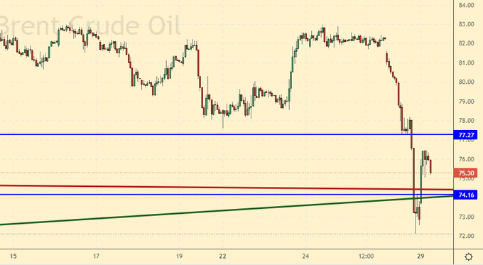 Рынок нефти утром понедельника незначительно восстановился после сильного падения в пятницу. Вероятнее всего медведи будут давить на котировки сегодня стараясь закрепиться ниже 70.00. Сообщество будет переваривать информацию, поступающую по новому штамму «омикрон» и пока идет процесс осознания новой реальности большинство будет продавать.