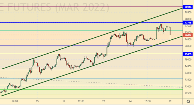 Покупка: нет. Кто в позиции от 73400 и 76000, держите стоп на 75800. Цель: 79000 (83500?!).