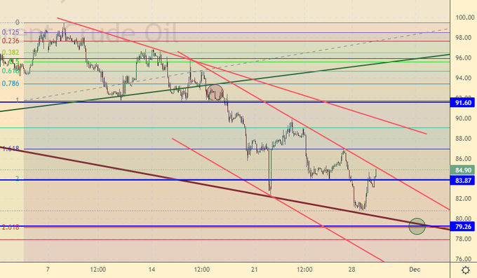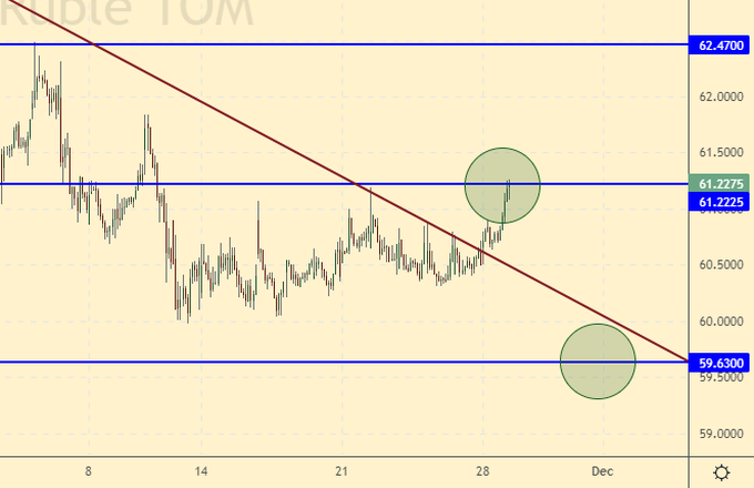 Рублю не понравилось снижение цен на нефть. Не исключено, что до заседания ОПЕК+ 4-го декабря медведи по нефти не станут атаковать, и ситуация с курсом из-под контроля не выйдет ближайшую неделю. Отметим, что есть угроза наращивания импорта в страну перед новым годом, что повысит спрос на валюту.