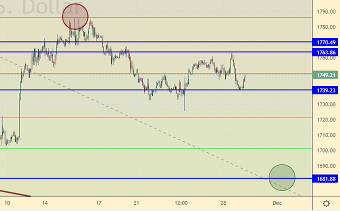Видим интересную контратаку со стороны продавцов от 1763. Скорее всего мы сходим на 1680, так как доллар будет оставаться сильным перед заседанием ФРС. В случае хода выше 1800 быки захватят инициативу на долго.